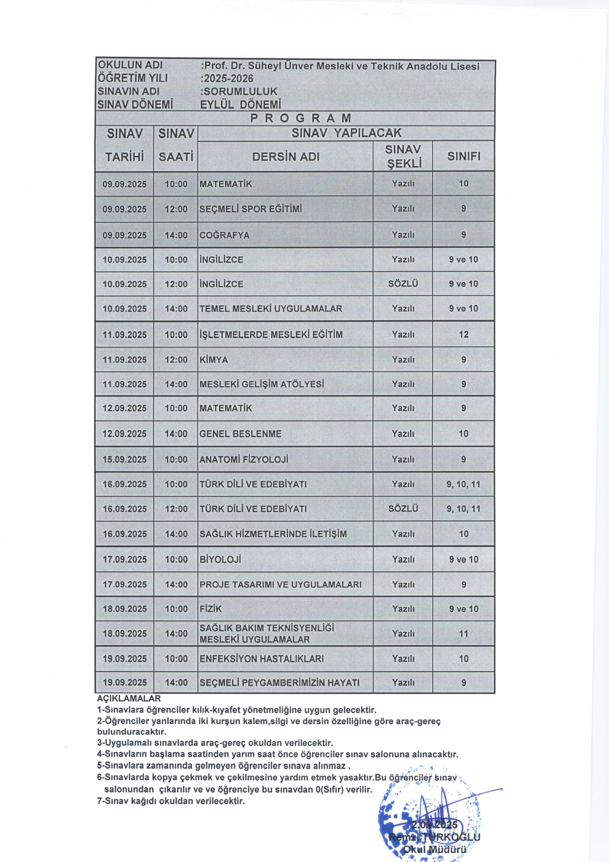 8-19 EYLÜL TARİHLERİ ARASINDA SORUMLULUK SINAVLARI YAPILACAKTIR. SINAV PROGRAMI EKTE SUNULMUŞTUR.
