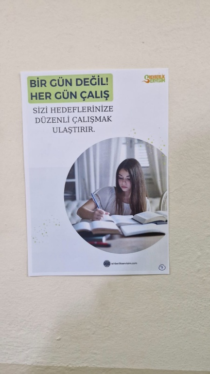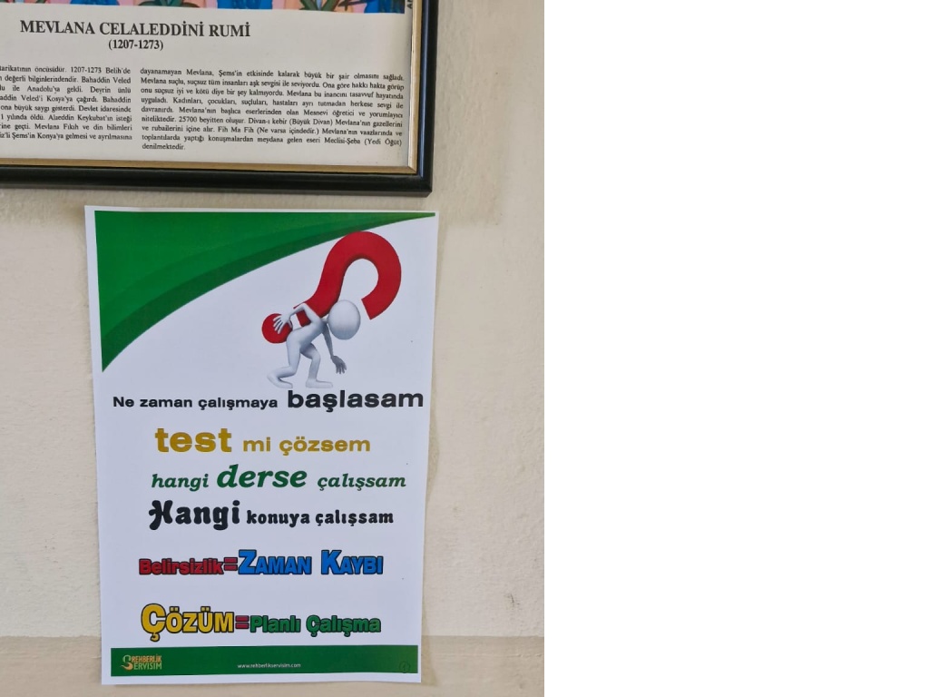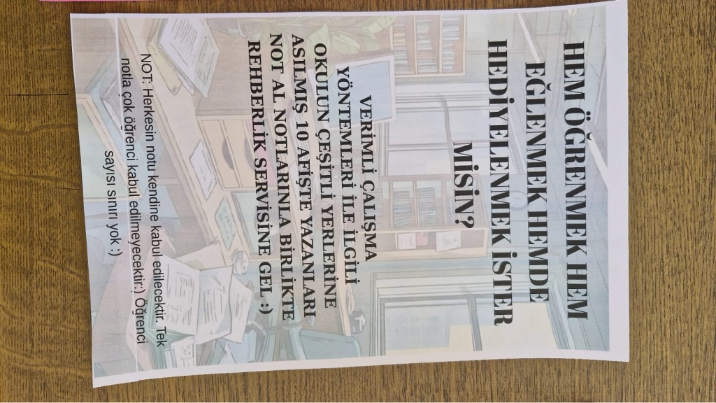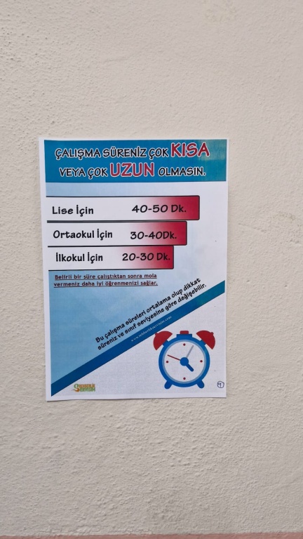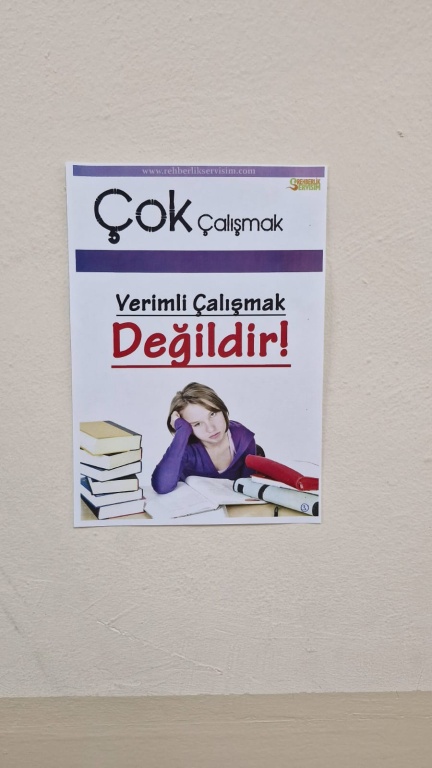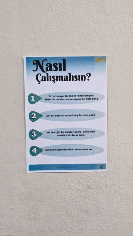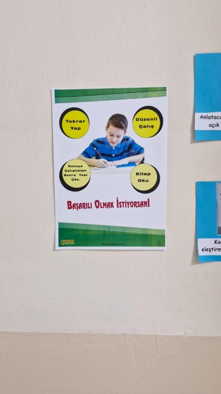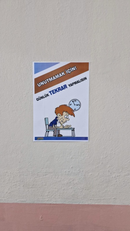 Okul rehberlik servisimiz tarafından okulumuzun çeşitli alanlarına "Verimli Ders Çalışma" konulu bilgilendirme içerikleri asılmıştır. Farkındalığı ve etkileşimi arttırmak amacıyla etkinlik düzenlenmiştir.